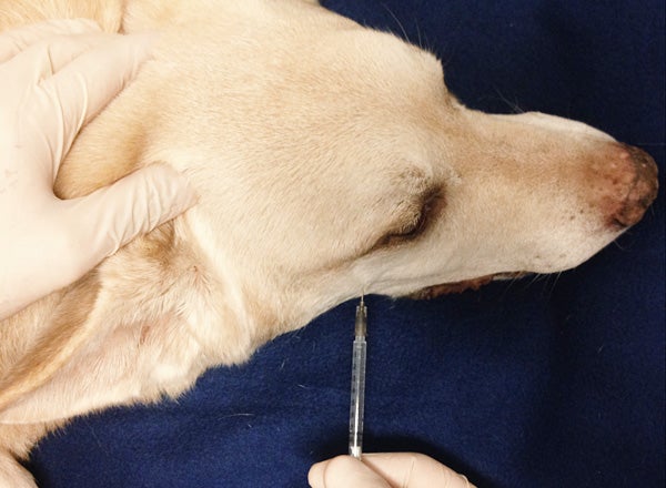 Benadering: caudaal van de bovenkaak, craniaal van de processus coronoideus van de onderkaak, onder de rostrventrale grens van het os zygomaticum, loodrecht op de huid