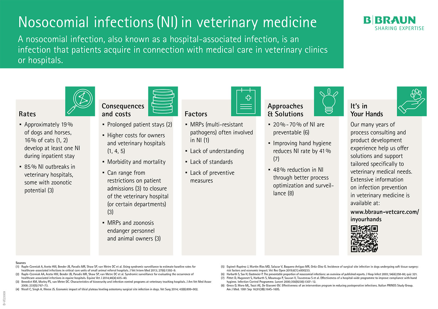 Nosocomiale infecties, ook bekend als ziekenhuisinfecties, zijn infecties die patiënten oplopen tijdens het ontvangen van medische zorg in dierenklinieken of dierenartspraktijken. Nosocomiale infecties (NI) en multiresistente ziekteverwekkers vormen een groeiend probleem in de diergeneeskunde. Het doel van B. Braun Vet Care is om bewustzijn te creëren en oplossingen te bieden die in jouw handen liggen.