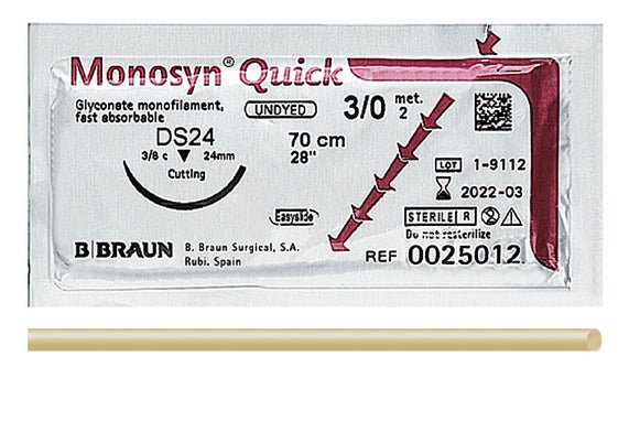 Monosyn® Quick is een korte termijn resorbeerbaar en monofilament hechtmateriaal. Vanwege de korte resorptietijd wordt Monosyn® Quick gebruikt in dierenartsenpraktijken en klinieken, met name in de tandheelkundige chirurgie en voor hechtingen van het slijmvlies. Dankzij goede elasticiteit en flexibiliteit in combinatie met betrouwbare knoopbaarheid is Monosyn® Quick enorm geschikt voor wonden die slechts voor een korte tijd ondersteuning nodig hebben.