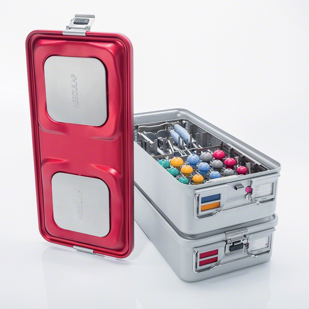 PrimeLine® PRO robuust aluminium deksel met levenslange filterfunctie. Het systeem met unieke eigenschappen en ingebouwde compatibiliteit met containerbodemonderdelen die sinds 1988 zijn vervaardigd. Aesculap benadrukt zijn wereldwijd leidende positie als fabrikant van steriele containersystemen voor steriele levering in ziekenhuizen.